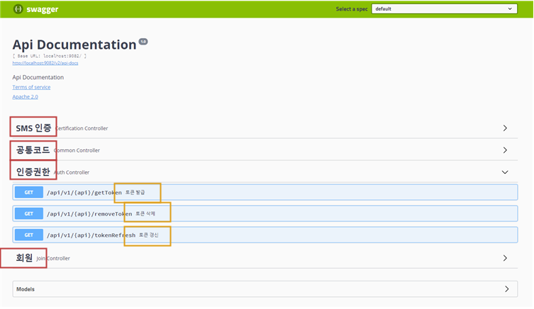 Swagger UI 사진 속 빨간 상자 안의 'SMS 인증', '공통코드', '인증권한', '회원'은 각 Controller의 @Api 어노테이션 tags 값입니다.