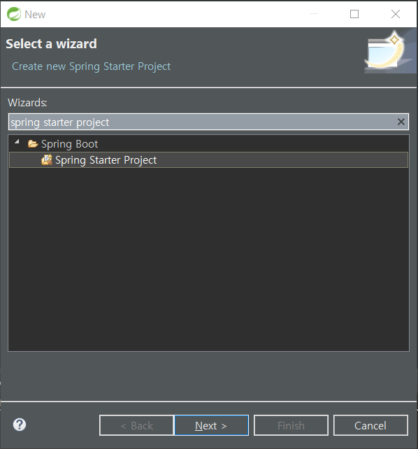 프로젝트 생성을 눌러주고 검색 박스에 'Spring Starter Project'를 검색한 후 목록에서 선택하여 Next 버튼을 누른다.