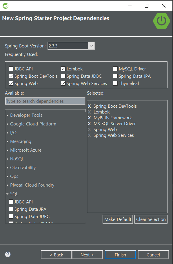 추가할 Dependency를 추가한 후 Finish 버튼을 눌러 프로젝트 생성을 마친다.