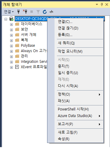 가장 상단의 'SQL Server'를 클릭하고 마우스 오른쪽을 눌러 재시작 버튼을 눌러준다.